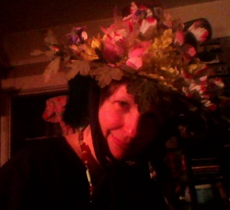 Yesterday I celebrated Beltaine /mayday/ international workers day by attending the rally downtown with friends, creating a collaborative healing mandala, and enjoying a seafood feast with may wine. Today I went to Faire in the Grove to hear my good friends Karsilama play their latest ancient ottoman tunes, and learned how to make natural pigment paints and woven Turkish buttons. I saw the full moon rise over a giant field of red clover as the sun set over the coast range. Did not get to dance around the may pole this year, however, nonetheless, magic is in the air and I enjoyed myself thoroughly. I do not have to be the star of the show, sometimes I am just as happy to sew buttons on the costumes. Here I am in my traditional may bonnet.